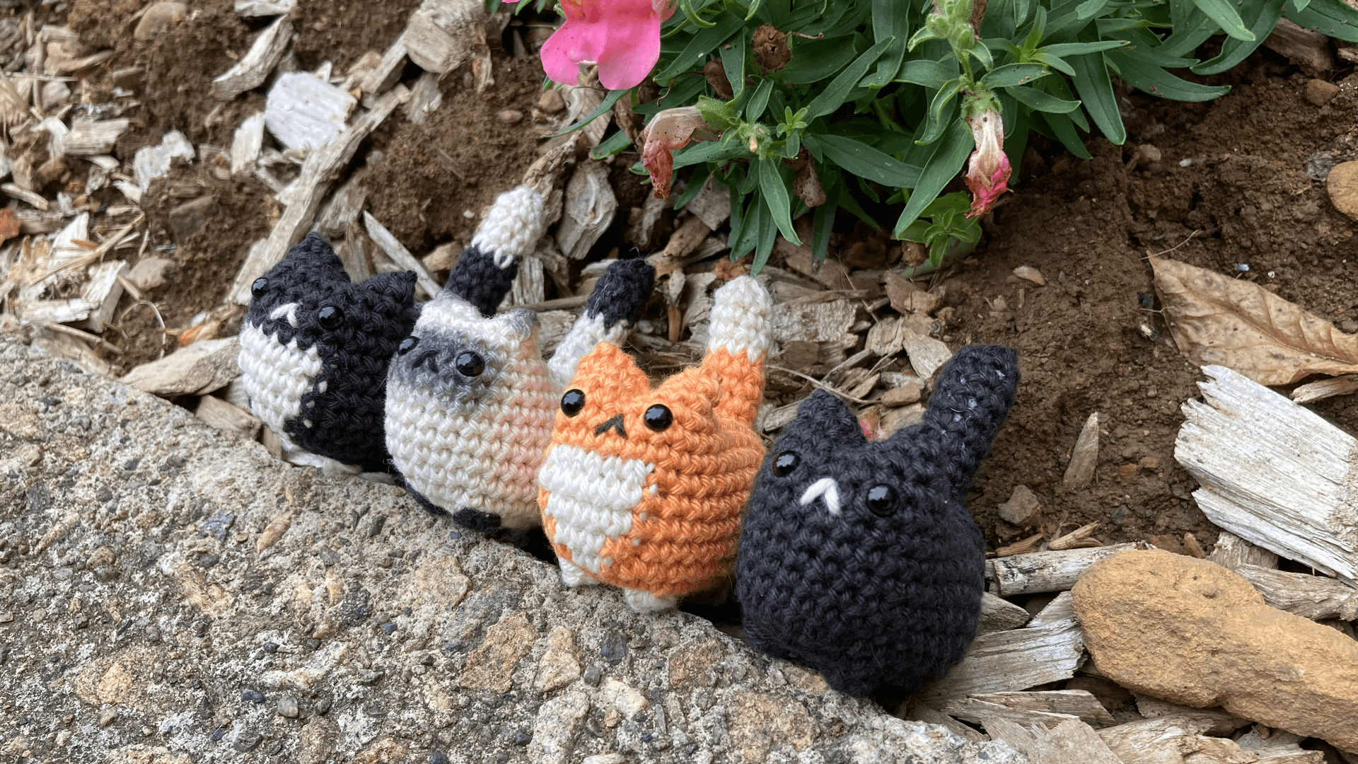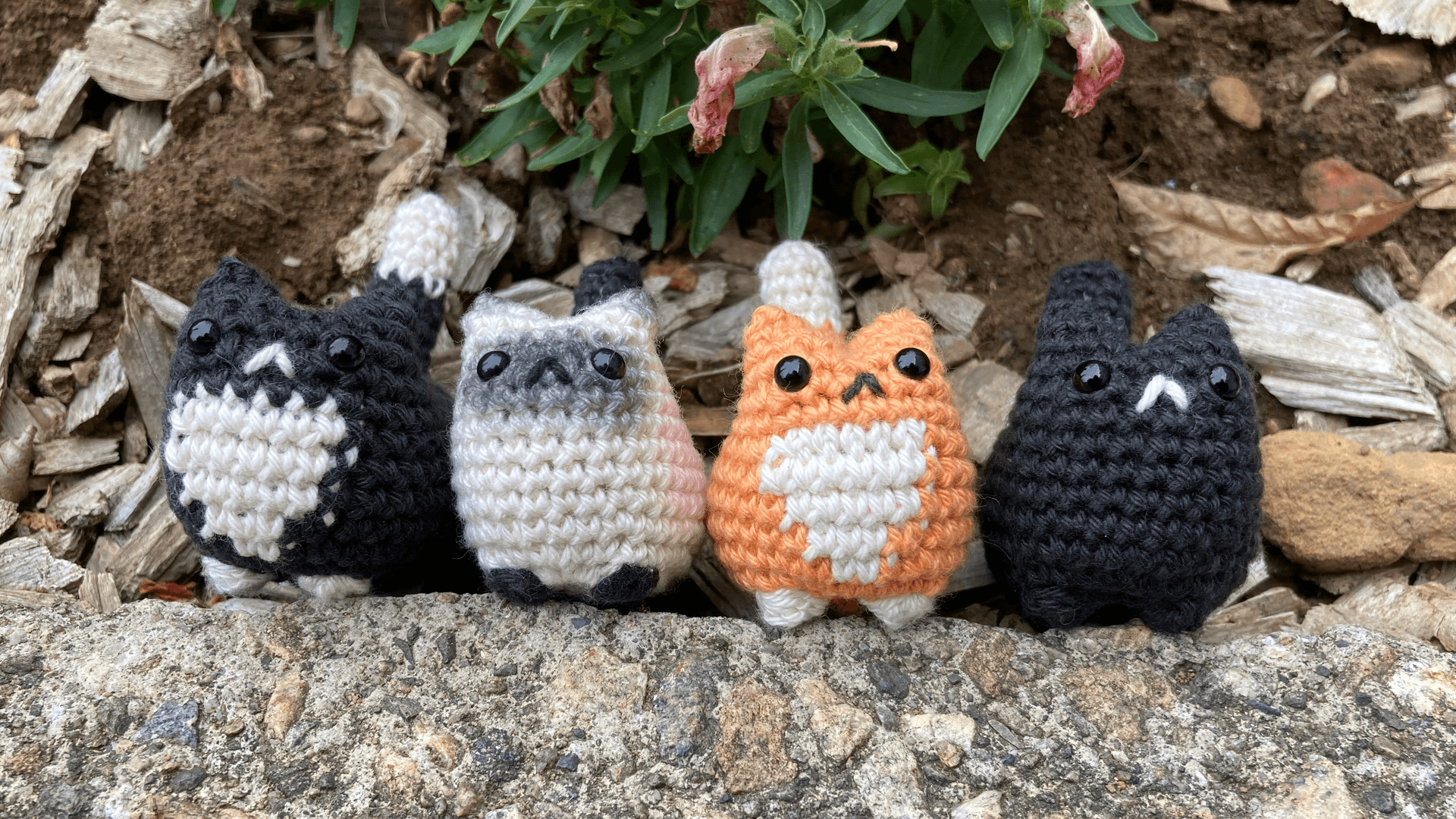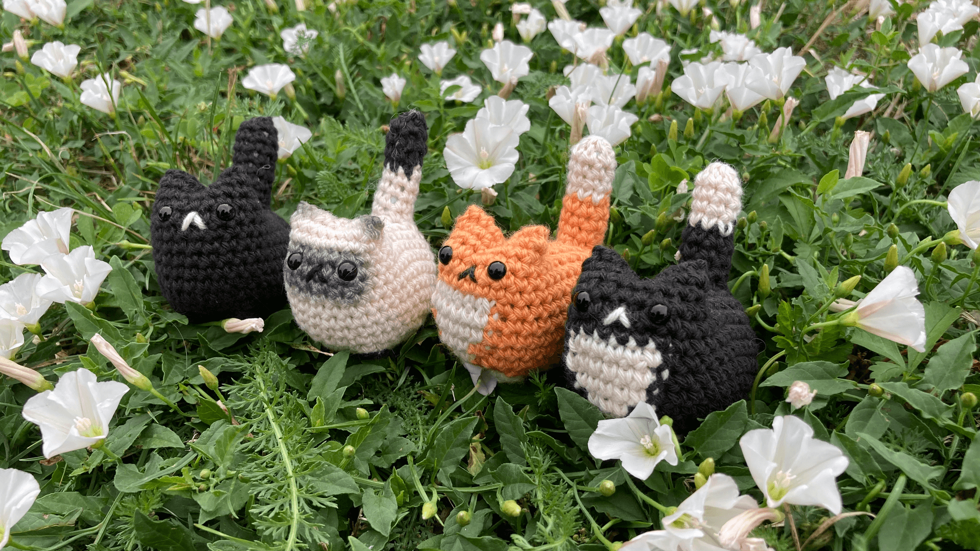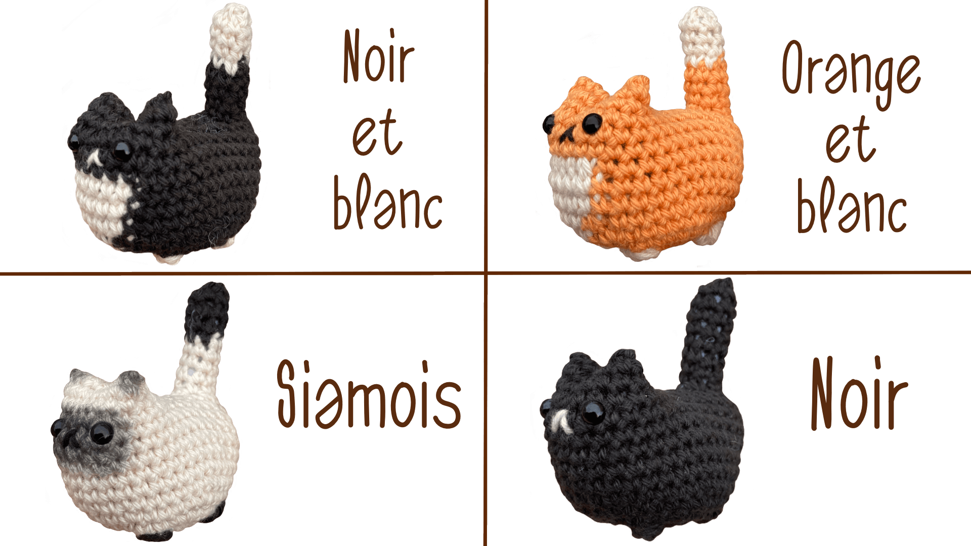 Choisissez entre le chat siamois "Plume", le roux et blanc, le tout noir ou noir et blanc.... ou adoptez les tous ! Pour les chats roux et blanc et noir et blanc, une version plus grande crochetée avec un fil chenille tout doux, est également présente dans la catégorie "Fluffies".