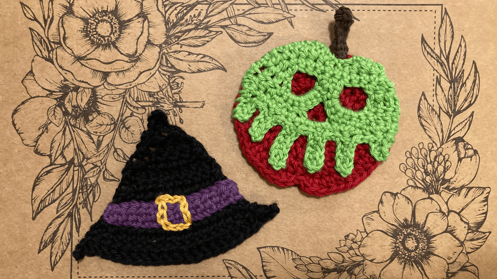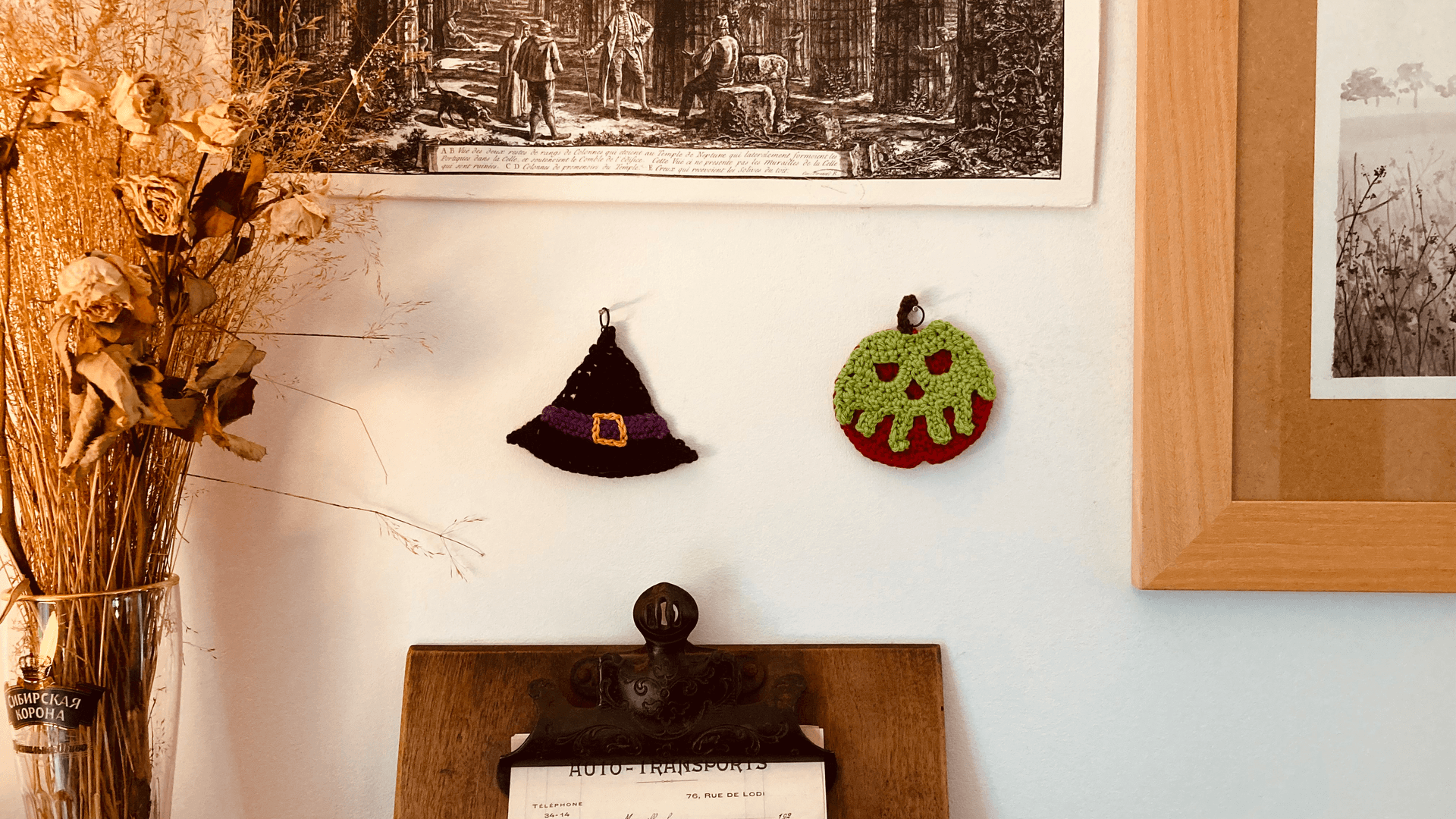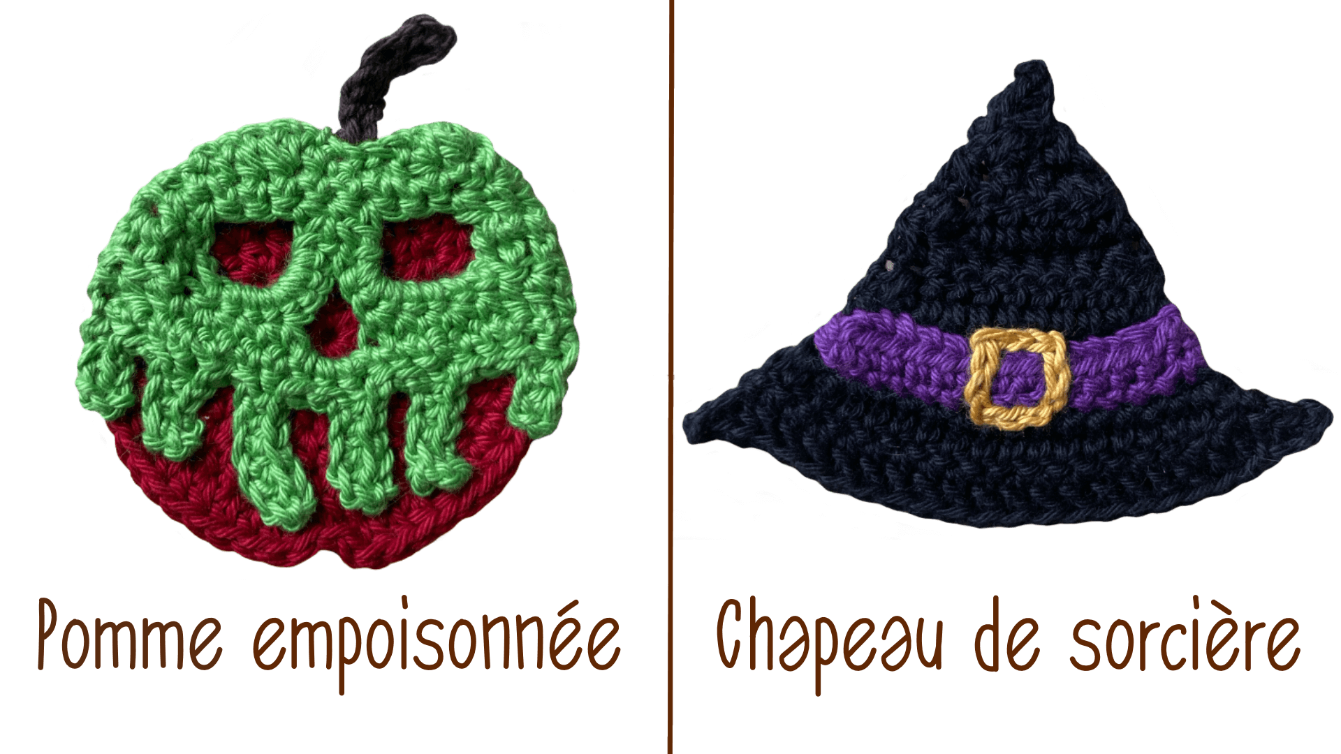 Décorations d'Halloween faites main au crochet. Pour les plus grandes nous vous proposons La Pomme Empoisonnée et Le Chapeau de Sorcière. Elles seront parfaites pour apporter une touche de couleur et un coté "Halloween" à votre intérieur, simplement accrochées au mur ou agencées en guirlande, ou encore cousues en décoration sur votre sac/veste ... ou votre costume !