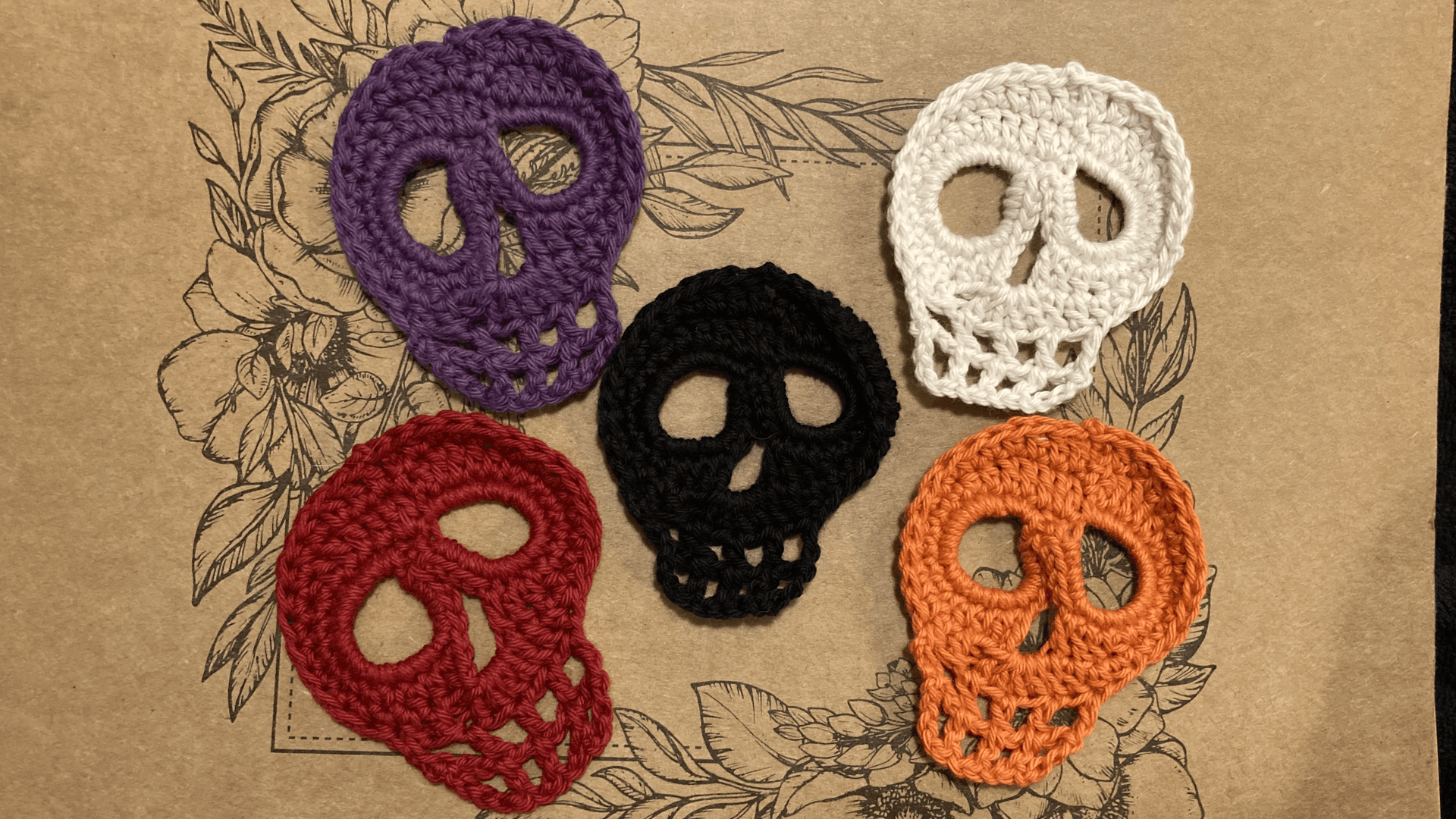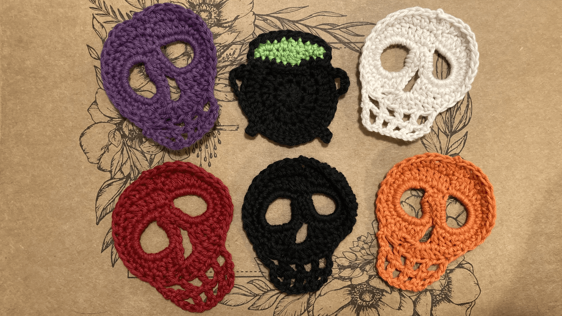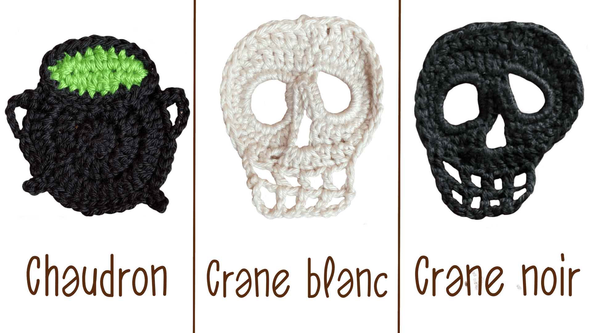 Décorations d'Halloween faites main au crochet. Pour les moyennes nous vous proposons Les crânes et Les chaudrons de sorcière. Elles seront parfaites pour apporter une touche de couleur et un coté "Halloween" à votre intérieur, simplement accrochées au mur ou agencées en guirlande, ou encore cousues en décoration sur votre sac/veste ... ou votre costume !